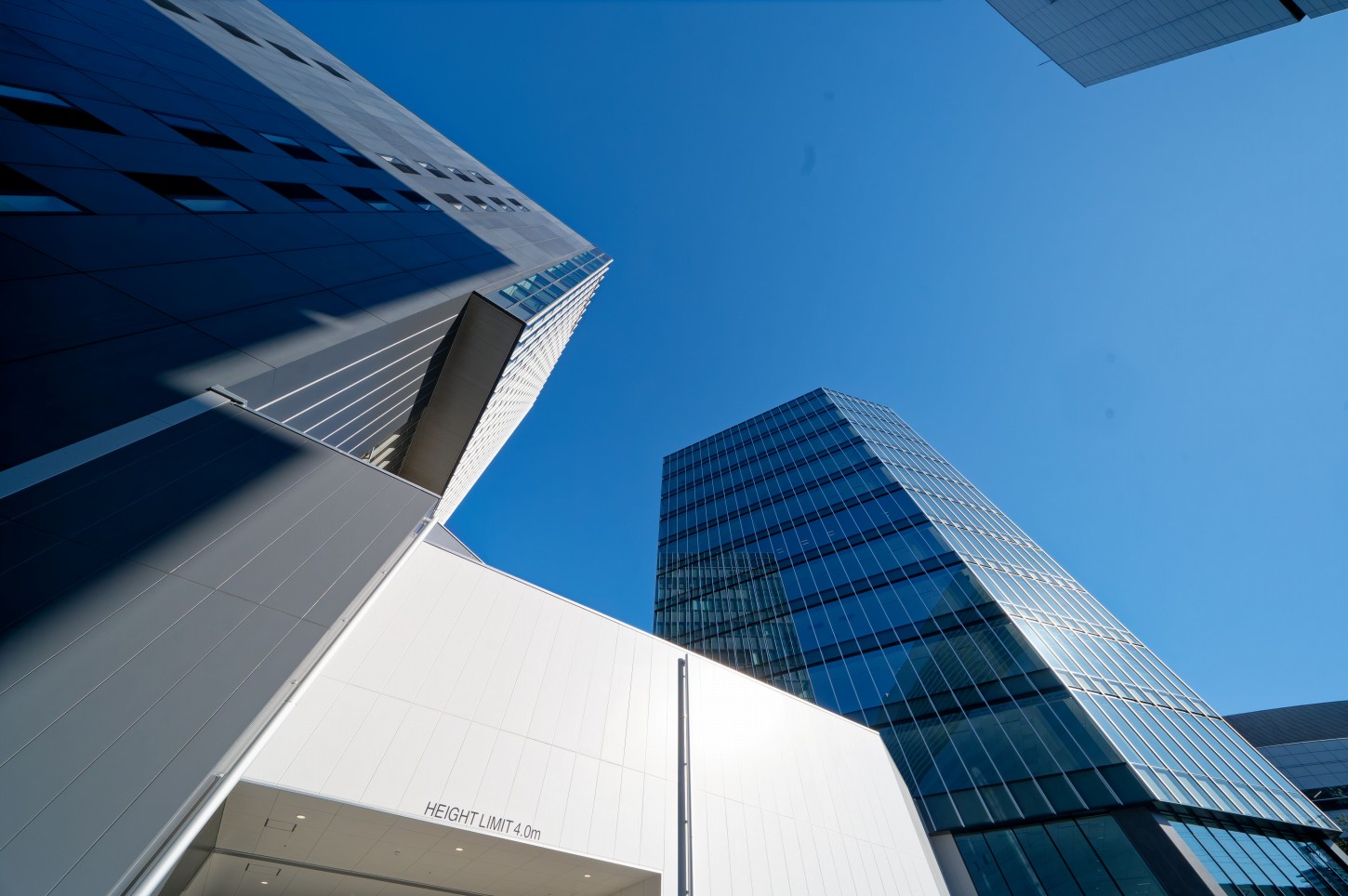 通路および回廊の出口に位置する、ビル2階レベルにオープンコートを配置し、新築棟の全景を見上げながら既存棟へアクセスできる、開放的な中間空間として計画しました。
