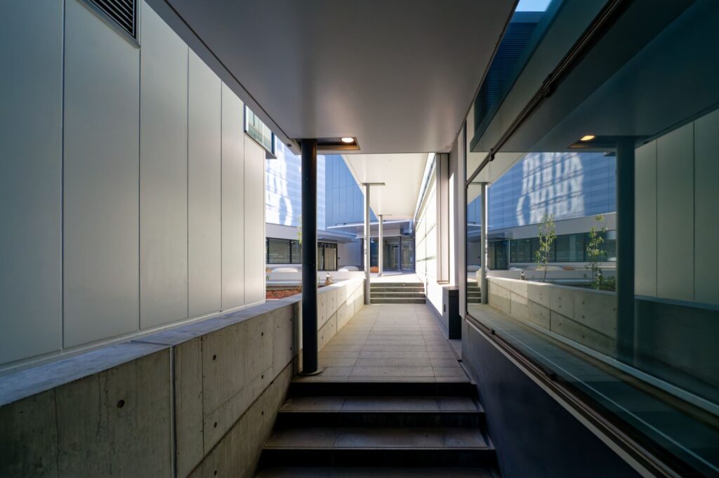 ここからそのまま2階レベルの中庭へ直接上がることができる立体的な動線を設け、そこから新築棟と既存棟を直結する回廊へと接続しています。